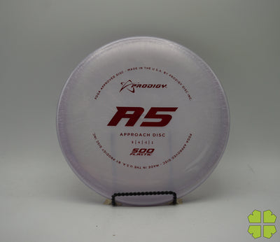 The Prodigy A5 is a slightly overstable approach disc that will work in to be a straight flyer. It has a nice, smooth feel with a shallow profile and flat top, which makes it ideal for sidearm approaches. It can handle torque well and has a mild finish on the end, so it won't skip too far from where it lands.