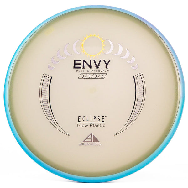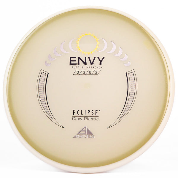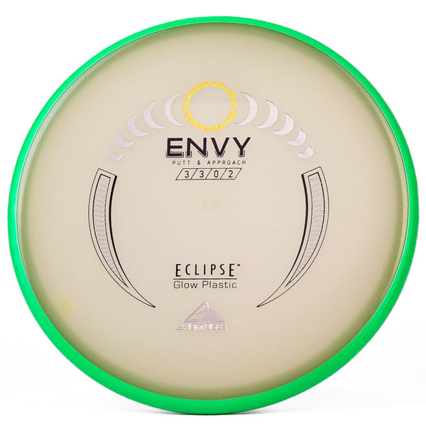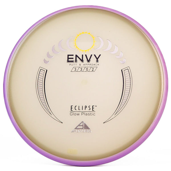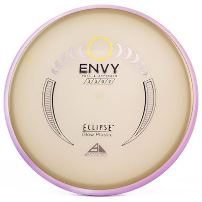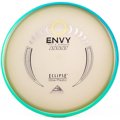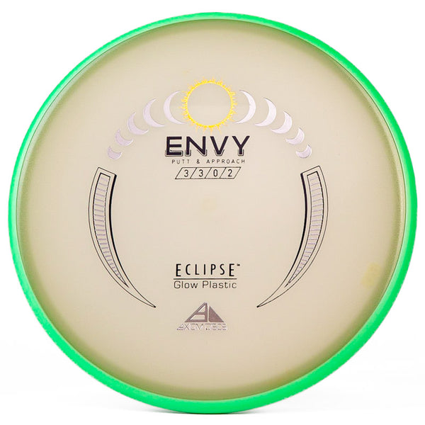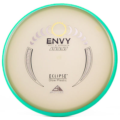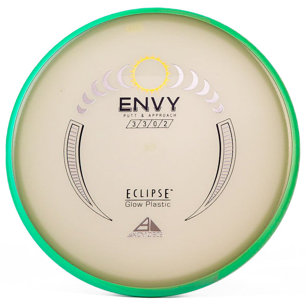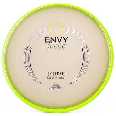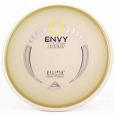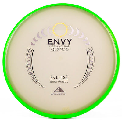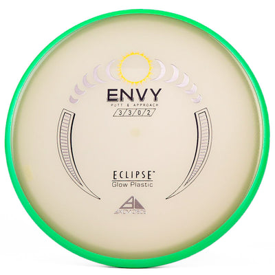 The Axiom Glow Envy is quite possibly the brightest glow in the dark putt & approach disc on the market. In Axiom's Eclipse Glow plastic the Envy has a little more fade, which is perfect for approach shots during your night round. Eclipse plastic is also very grippy, so if you want to bang some chains with this putter you can do it with ease. The added stability and fade makes this putter a phenomenal forehand disc for those technical, precise upshots. As a highly useful approach disc, throwing putter, or putting putter; you honestly can't go wrong with this Axiom Eclipse Glow Envy!