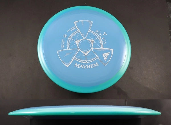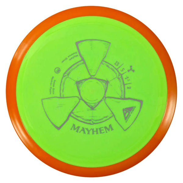 The Axiom Mayhem in Neutron plastic delivers a bright, premium feel with excellent grip and long-lasting durability. Neutron plastic is known for its balanced firmness and tacky hand feel, giving the Mayhem a clean, confident release whether you're throwing backhand or forehand. This version keeps the mold’s fast, glidey, slightly understable profile intact, making it a go-to choice for players looking to shape long-distance lines with ease.