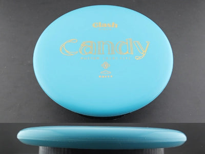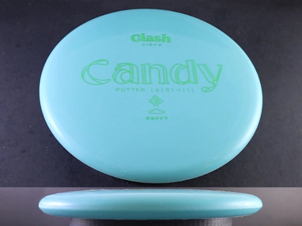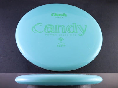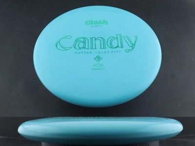The Softy Candy brings Clash Discs’ beadless, straight-to-understable putter into their softest, most flexible plastic blend. Softy plastic offers a cushioned, tacky feel that grabs the chains and sits down quickly on approaches. With its slightly slimmer profile compared to the Popcorn, the Candy provides a clean release and effortless control, making it an excellent choice for touch putts and gentle shaping lines.