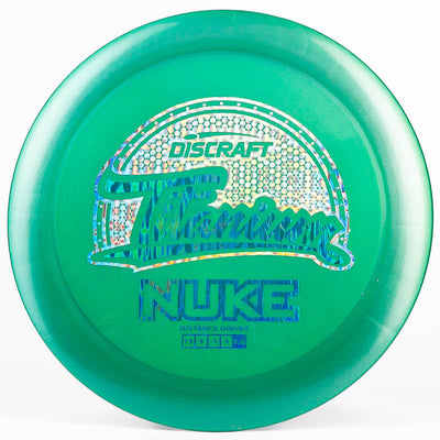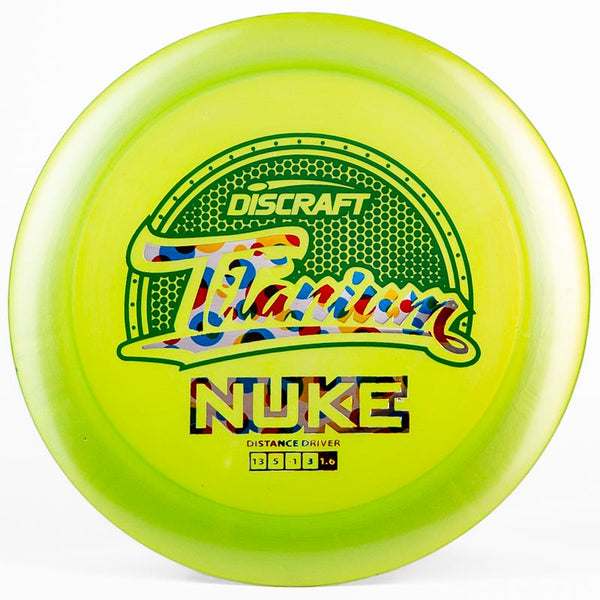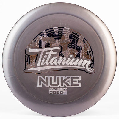 The Discraft Nuke (Titanium) is an overstable distance driver that is made with very stable plastic and is designed for power distance drives. There's a reason you see every Discraft-sponsored player bag a Nuke: because it is a long distance bomber for anyone with developed arm speed.