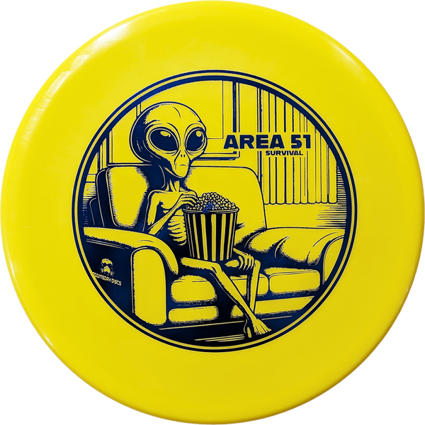 The Doomsday Discs Area 51 in Survival plastic brings this straight-to-understable fairway driver into a durable, grippy blend built for all-condition reliability. Survival plastic has a semi-flexible, tacky feel with impressive toughness—perfect for players who want a disc that holds up to heavy use while still offering great control. This version of the Area 51 maintains the mold’s easy-turning flight and smooth glide, making it a dependable tool for shaping lines and navigating tricky fairways.