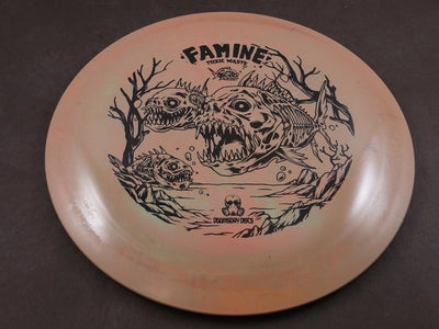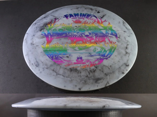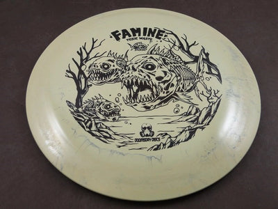 Famine flies understable-to-neutral: flip it to flat for long, drifting pushes or release it flat for a gentle turn that glides before a soft, forward fade. The comfortable rim makes it friendly for developing arms while still offering shapeable distance for experienced throwers.