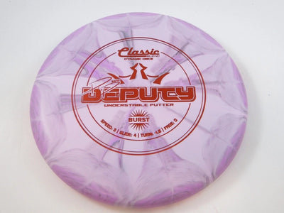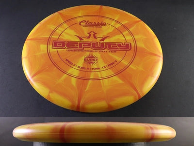 Known for its straight, glidey flight, the Deputy excels at holding a true line with minimal fade. In Classic Blend Burst plastic, it maintains the same reliable feel and control as the standard blend while adding a touch of visual flair. Whether you’re sinking putts in the circle or shaping gentle turnovers on approach shots, the Deputy’s understable stability and strong glide keep it on target.