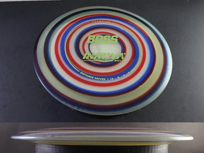 In Champion Dyed plastic, the Boss maintains its signature fast, overstable flight. Expect a mild high-speed turn to help stretch out the distance, followed by a strong, predictable fade. Thrown hard, it produces long, sweeping S-curves; with hyzer, it stays on angle and finishes aggressively; and on forehand lines, it resists torque exceptionally well. Champion Dyed runs remain stable for a long time, even after heavy use.