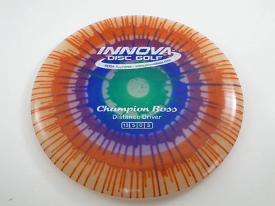 The Innova Boss in Champion Dyed plastic brings this high-speed, overstable distance driver into a durable, eye-catching blend with unique dyed artwork on every disc. Champion plastic is known for its stiff, torque-resistant feel and long-lasting stability, and the dyed version adds vibrant designs without altering the disc’s dependable flight. This run of the Boss is ideal for power players who want max-distance performance paired with premium aesthetics.