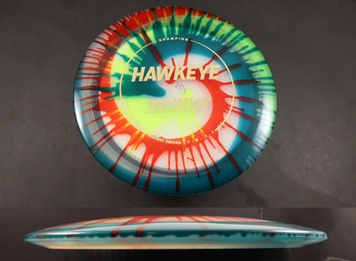 At speed the Champion Dyed Hawkeye flies straight with a touch of high-speed turn and a clean, forward fade. The durable Champion plastic ensures long-lasting stability, while the factory dye patterns make each disc one-of-a-kind, combining performance and personality in one package.