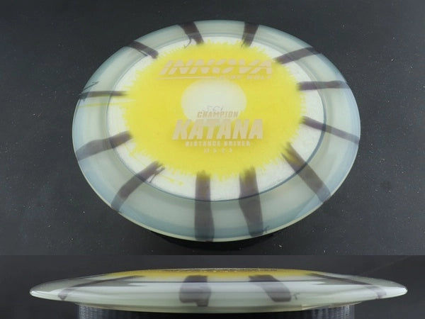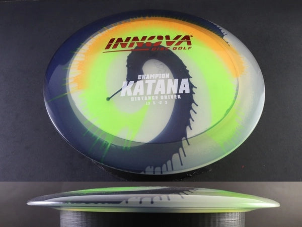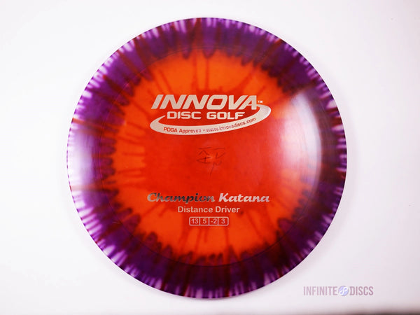 The Innova Katana in Champion Dyed plastic pairs this high-speed, understable distance driver with the durability and stability of Champion plastic—enhanced by custom-dyed artwork that makes every disc unique. Champion Dyed retains the same stiff, long-lasting feel as standard Champion, giving players reliable performance while adding standout visual appeal on the course.