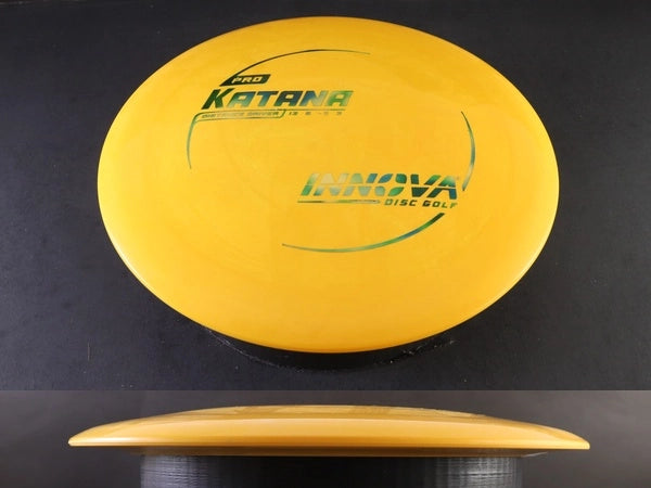 The Pro Katana by Innova delivers explosive distance with a grippy, flexible feel that helps generate effortless power. Crafted from Pro plastic, it offers enhanced glide, a touch more understability than premium blends, and a comfortable texture that seasons into even longer, more workable flights. Designed for massive turnover shots and long-distance flex lines, the Pro Katana is one of the easiest high-speed drivers to throw far.