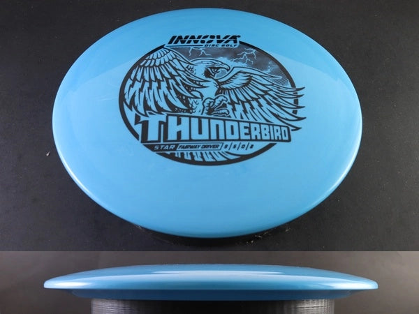 The Star Thunderbird by Innova is a power control driver that combines distance, accuracy, and dependability in one of the most trusted molds in disc golf. Star plastic offers the ideal blend of premium grip and long-lasting durability, giving the Thunderbird a consistent, stable flight that holds true throw after throw.