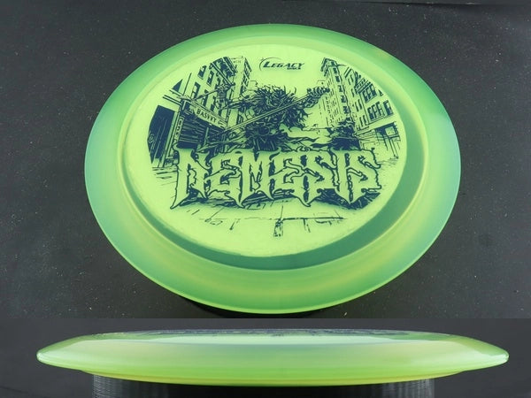 The Legacy Nemesis is an understable distance driver built for effortless glide, big-turn flight paths, and strong finishing fade. With a speed of 10 and high glide, the Nemesis is perfect for players seeking maximum distance without maximum effort. Designed to bridge the gap between the Cannon and the Patriot, this disc delivers long, controlled turnovers and dramatic S-curve flights, especially for slower arms or tailwind conditions.