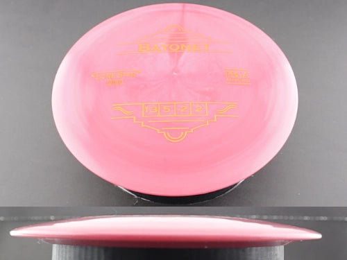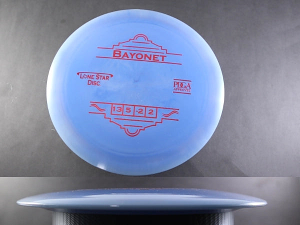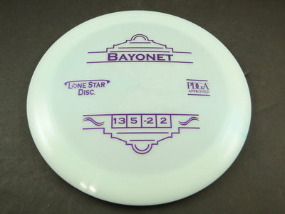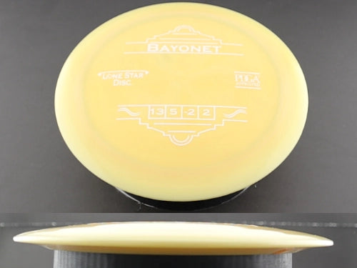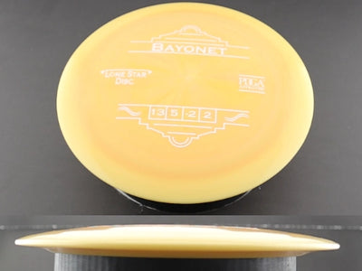 The Alpha (Lonestar) Bayonet gives you the same max-distance performance in a firmer, premium plastic blend designed for consistent grip and durability. Alpha (Lonestar) is Lone Star’s flagship plastic—comparable to ESP from Discraft—with a touch more stiffness than Bravo, making it ideal for players who want a fast disc that resists turn and holds up to repeated throws.