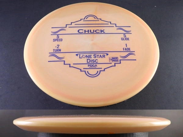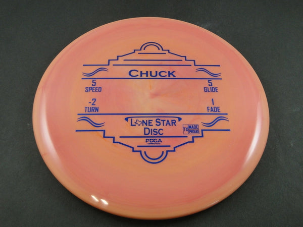 The Lone Star Disc Chuck is a controllable, semi-understable midrange that delivers effortless glide and smooth turn. With flight numbers of 5 / 5 / -2 / 1, it's ideal for straight shots, hyzer flips, and gentle turnovers. Whether you're a newer player learning to shape lines or a seasoned thrower looking for a finesse midrange, the Chuck offers consistency and control with just the right amount of movement.