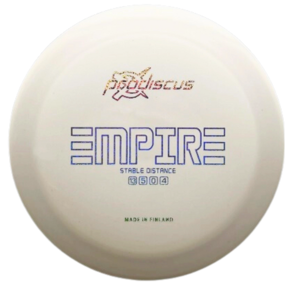 The Prodiscus Empire is a fast, power-demanding distance driver built for players who want maximum stability and control at the highest speeds. With its 13-speed rating and wide rim, the Empire is designed for advanced arms looking for a disc that won’t turn over even in fierce wind conditions. Whether you're launching massive hyzers, battling headwinds, or needing a consistent skip finish, the Empire has you covered.