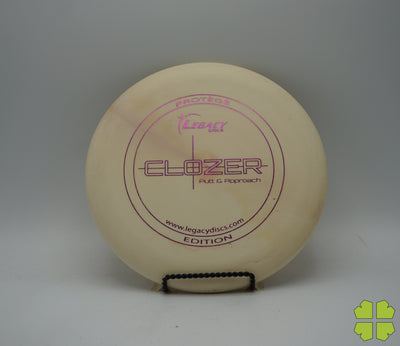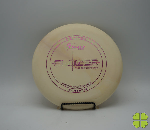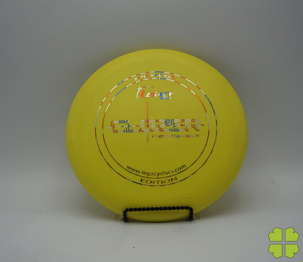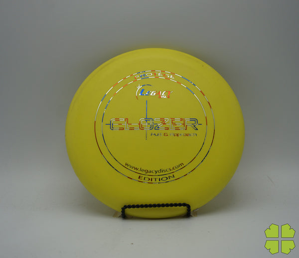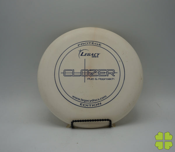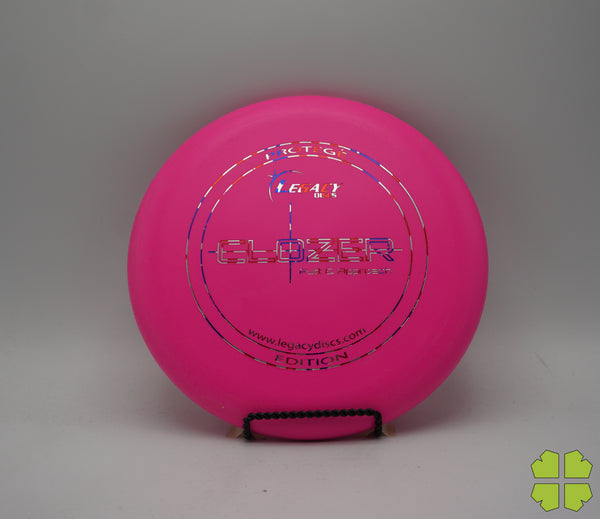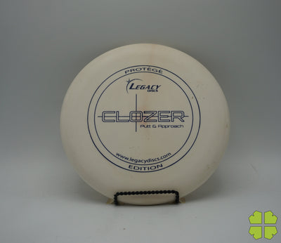 The Clozer is a straight flying, low speed disc that has fade at the end of its flight. This disc can be a stable short range driver or a putt and approach disc. It was designed to give a player the edge for a short range drive, upshot, or putt into a head wind.