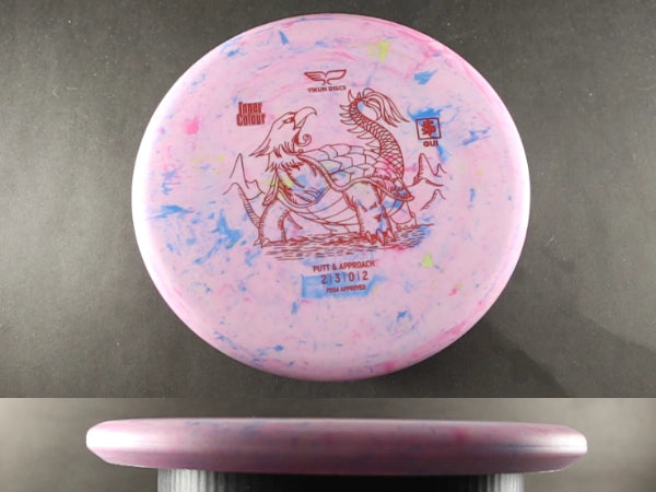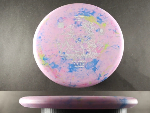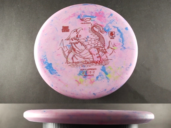 The Yikun Gui is a stable-to-overstable putt and approach disc designed for precision and consistency. In Inner Colour plastic, the Gui gains a tacky, weather-ready feel with bold color patterns that stand out on the course.